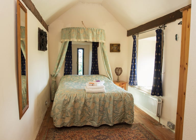 This cosy bedroom features a traditional four-poster bed, wardrobe, and central heating, combining historic charm with modern comfort.
